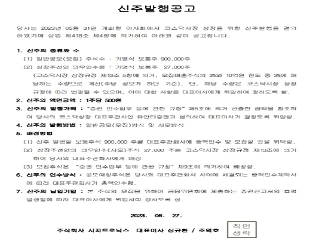 다음으로 시지트로닉스 홈페이지에 올라온 신주발행 공고문입니다.