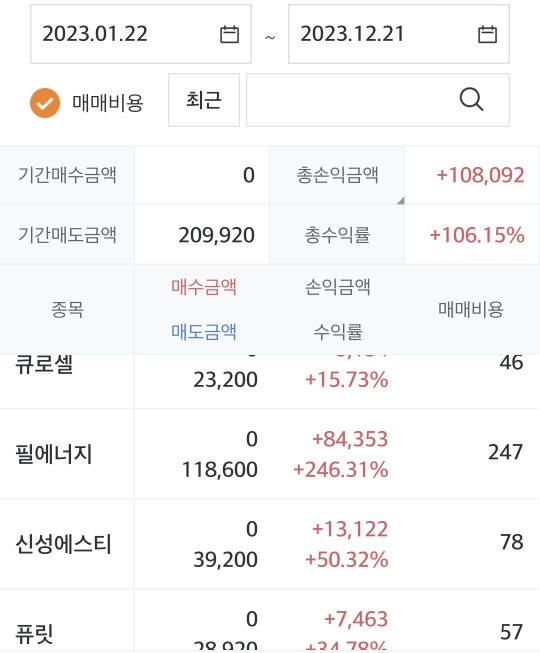모두 수익이 난 것은 아니고, 매도 시점을 놓쳐 손실이 난 종목들도 있다는 점 참고 바랍니다.