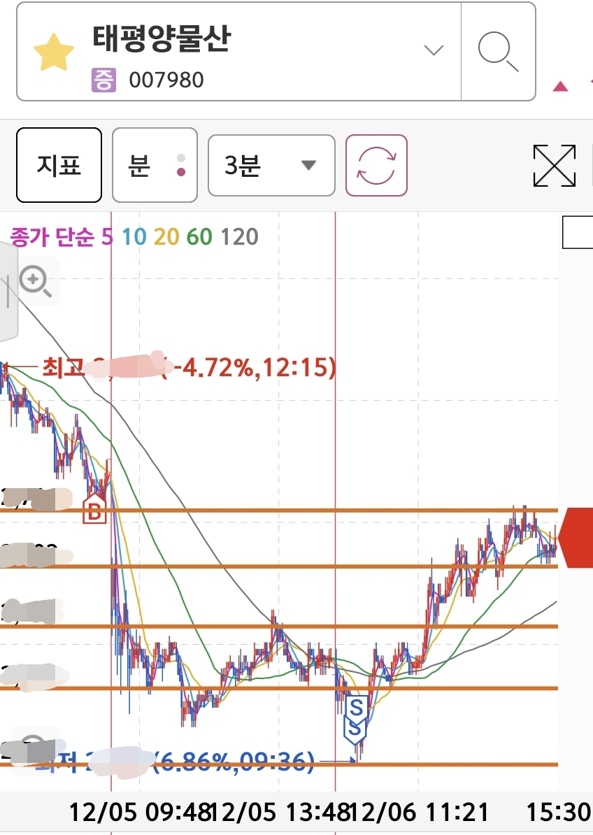 다시 본절 부근, 본절가 약간 위에 반절,그리고 정해진 매수가에 남은 물량 익절