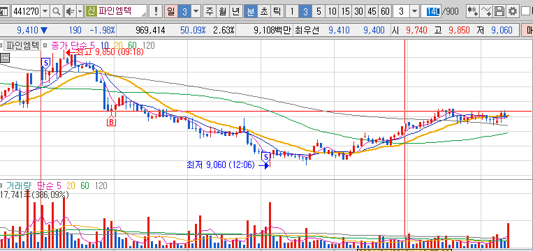 파인엠텍: 오전에 바닥에 바닥으로 한없이 빠지다 5%권에 손절을 하였다. 이후 오후 반등을 보여줬다. 4000원이란 수업료를 냈고, 언제든 손절이 나올수 있단 것을 느꼇다.